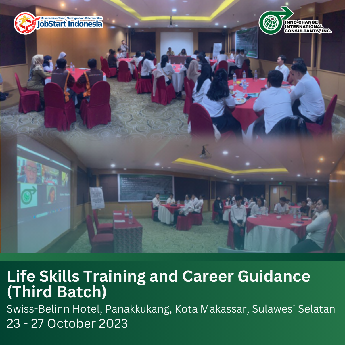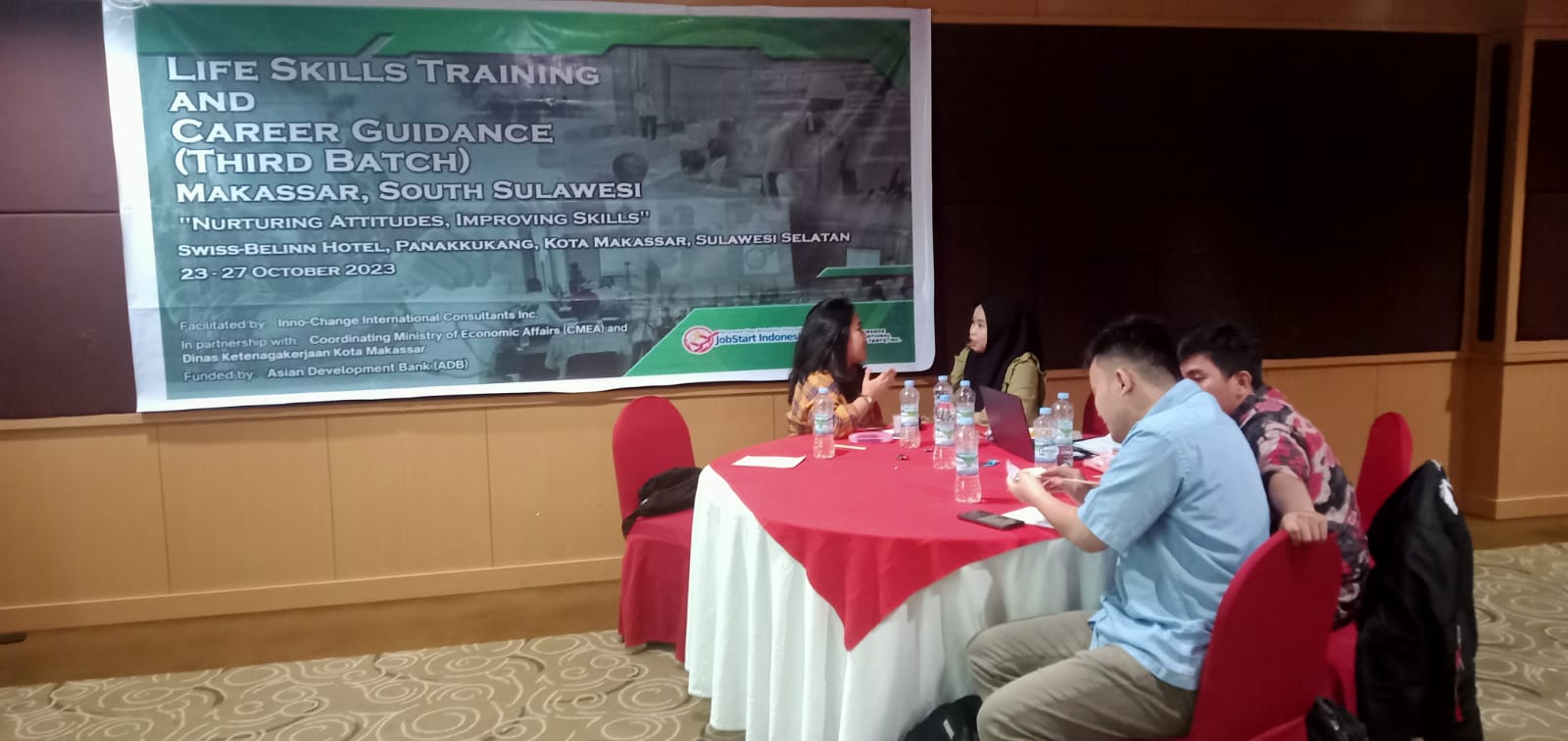 The JobStart Indonesia Life Skills Training and Career Guidance (Third Batch) was held in Swiss-Belinn Hotel, Panakkukang, Kota Makassar, Sulawesi Selatan, Indonesia dated 23 – 27 of October 2023. The Life Skills Training and Career Guidance (Third Batch) in Kota Makassar, Sulawesi Selatan was the Third Batch for the JobStart Indonesia Life Skills Training and Career Guidance for the project under TA-6924 REG: Southeast Asia Public Management, Financial Sector, and Trade Policy Facility (Phase II) – HCD2-I-F Labor Market Activation/Skills Development_HCD2-I-F (56047-001) funded by the Asian Development Bank (ADB).
