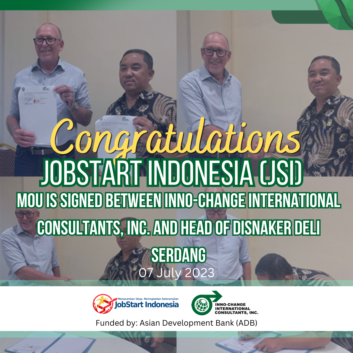 The Head of Disnaker of Deli Serdang, signed the JobStart Indonesia (JSI) Memorandum of Understanding on July 07, 2023. The Inno-Change International Consultants is implementing this project under the technical assistance (TA) contract with the Asian Development Bank (ADB) entitled TA-6924 REG: Southeast Asia Public Management, Financial Sector, and Trade Policy Facility (Phase II) – HCD2-I-F Labor Market Activation/Skills Development_HCD2-I-F (56047-001).